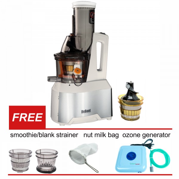 ReBoot master 6000 in white color, Including: juice strainer, blank strainer, smoothie strainer, nut milk bag, n231 ozone cleaner, cleaning brush, Thai/English manual and 2×1000 ml juice containers.